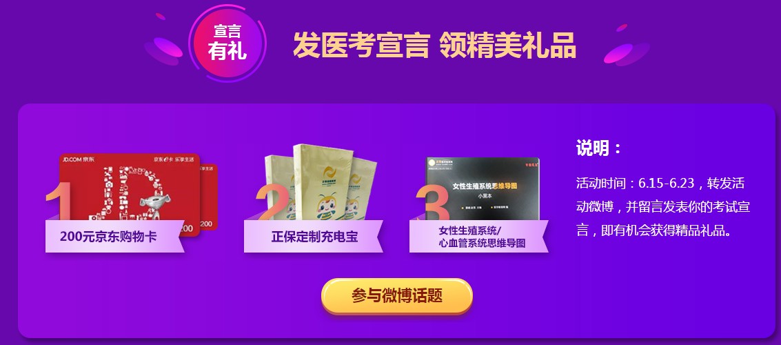 6.15-6.23,轉(zhuǎn)發(fā)活動微博,并留言發(fā)表你的考試宣言,即有機會獲得200元京東購物卡及精美禮品。