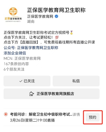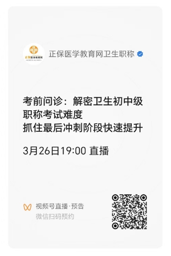 關(guān)注微信視頻號(hào)"正保醫(yī)學(xué)教育網(wǎng)衛(wèi)生職稱"(關(guān)注后中獎(jiǎng)概率會(huì)更高哦?。?/span>,可以掃碼直接預(yù)約直播。直播當(dāng)天會(huì)收到開播提醒,在直播間直接申請(qǐng)連麥與老師暢談。
