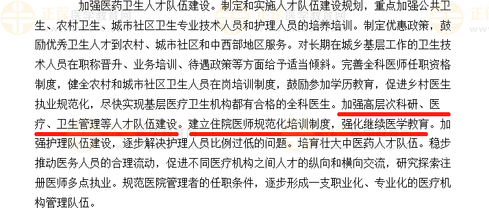 首先,讓我們來看一下近幾年國家對于醫(yī)藥衛(wèi)生體系改革的整體指導思路。2009年的《中共中央國務院關于深化醫(yī)藥衛(wèi)生體制改革的意見》和2016年的《“健康中國2030”規(guī)劃綱要》中都指出:要提升醫(yī)療隊伍整體素質建設,加強高層次人才隊伍建設。