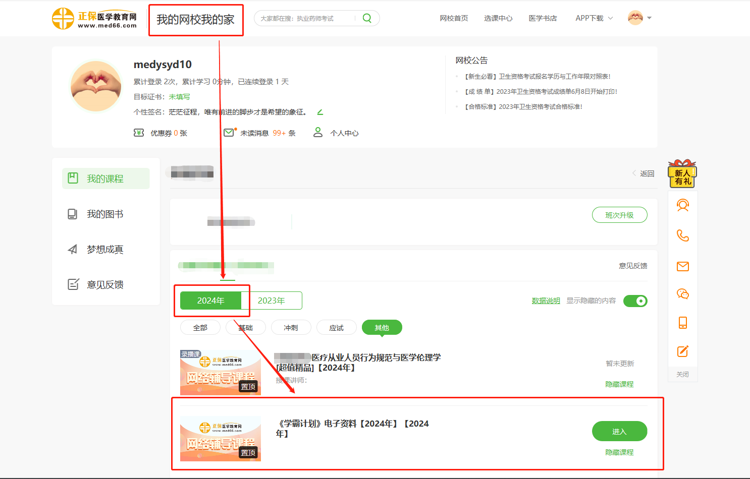 2024衛(wèi)生資格/護(hù)士輔導(dǎo)配套資料《學(xué)霸計(jì)劃》電子資料已上線,已購(gòu)買(mǎi)2024年衛(wèi)生/護(hù)士資格超值精品班/無(wú)憂實(shí)驗(yàn)班/高效定制班的學(xué)員可在[我的網(wǎng)校我的家]進(jìn)行查看/下載,醫(yī)學(xué)教育網(wǎng)為您整理詳細(xì)查看/下載流程!