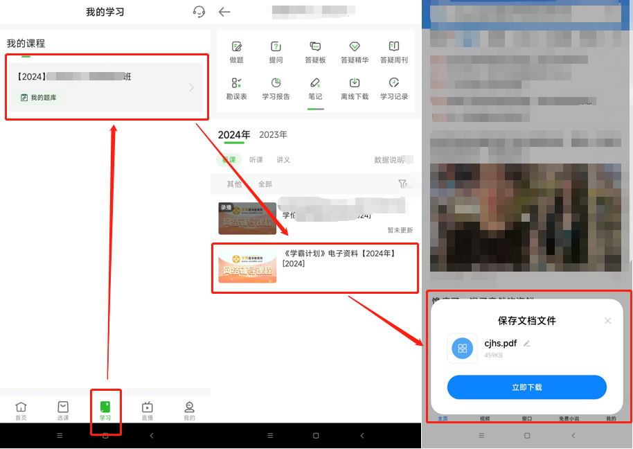 登錄【醫(yī)學(xué)教育網(wǎng)APP】-學(xué)習(xí)-選擇已購(gòu)課程-點(diǎn)擊《學(xué)霸計(jì)劃》電子資料-保存文檔文件