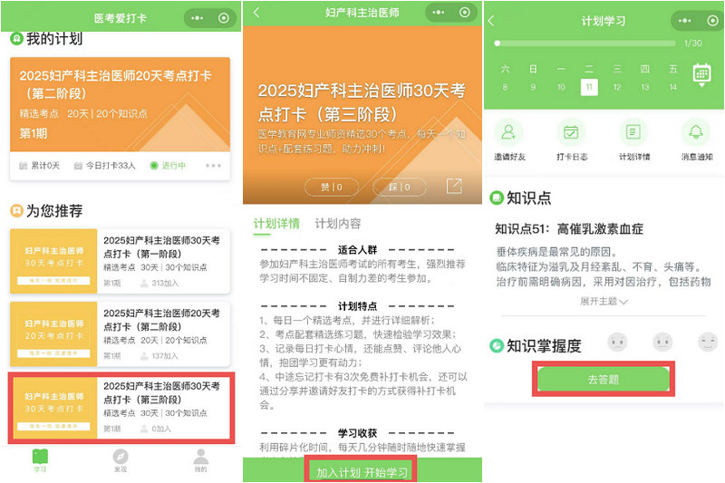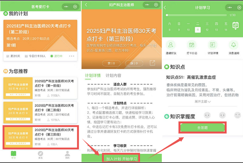 第三步:選擇打卡計劃,如“2025***30天考點打卡(第三階段)”,點擊下方“加入計劃開始學(xué)習(xí)”,進(jìn)入學(xué)習(xí)知識點并答題。