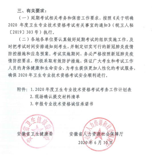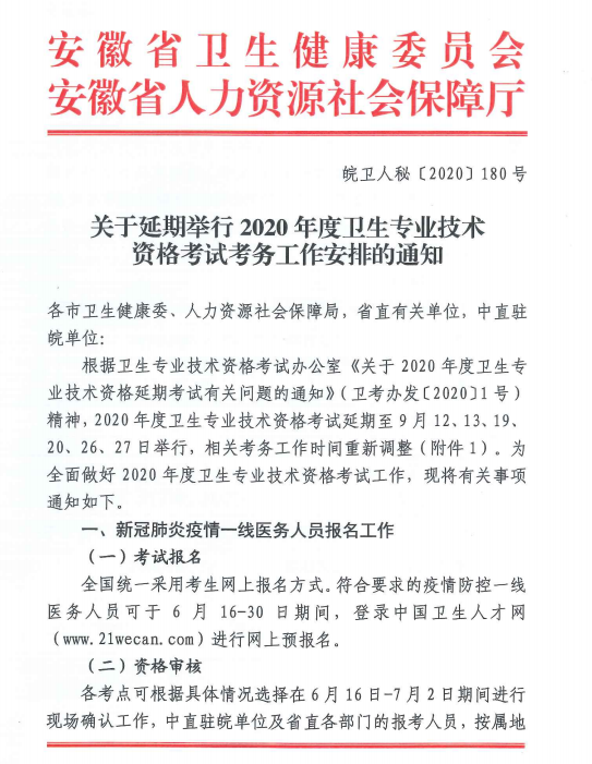 安徽省關(guān)于延期2020年衛(wèi)生專業(yè)技術(shù)資格考試考務(wù)工作安排的通知