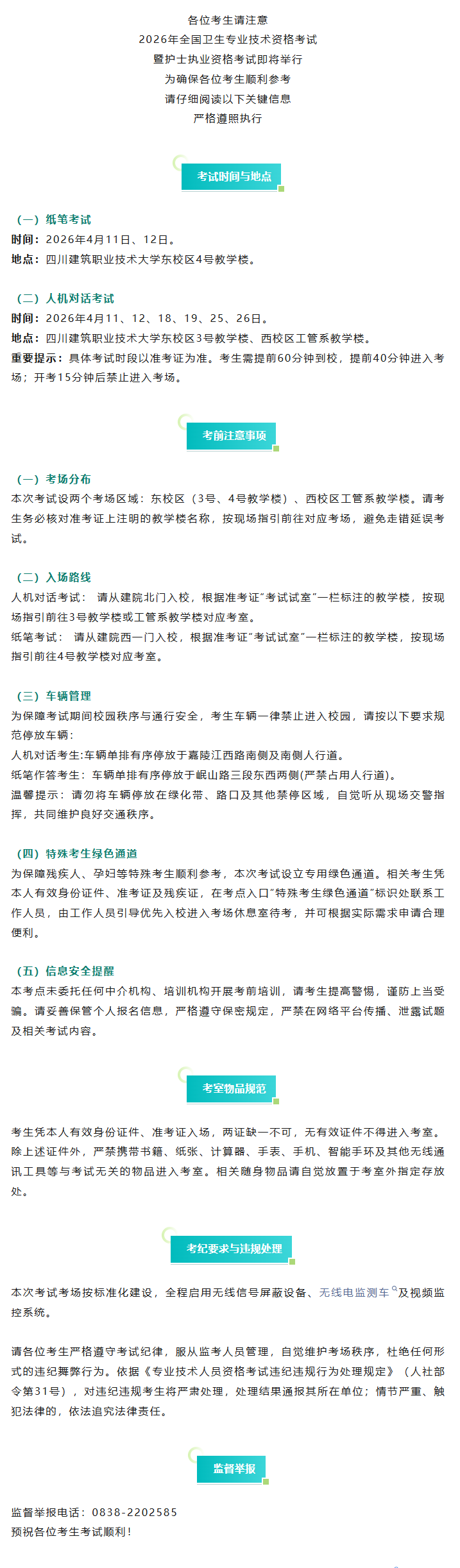 德陽考點(diǎn)2026年全國(guó)衛(wèi)生專業(yè)技術(shù)資格考試暨護(hù)士執(zhí)業(yè)資格考試考前公告