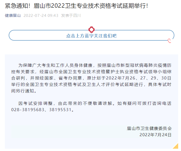 為保障廣大考生和工作人員身體健康,按照眉山市新型冠狀病毒肺炎疫情防控有關(guān)要求,經(jīng)眉山市全國(guó)衛(wèi)生專業(yè)技術(shù)資格暨護(hù)士執(zhí)業(yè)資格考試領(lǐng)導(dǎo)小組綜合研判,并報(bào)經(jīng)國(guó)家、省考辦同意,原計(jì)劃于2022年7月26、27、29、30日舉行的全國(guó)衛(wèi)生專業(yè)技術(shù)資格考試及衛(wèi)生人才評(píng)價(jià)考試延期進(jìn)行,具體考試時(shí)間另行通知。