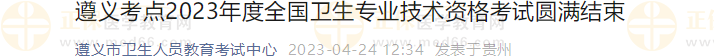 遵義市衛(wèi)生人員教育考試中心發(fā)布遵義考點(diǎn)2023年度全國衛(wèi)生專業(yè)技術(shù)資格考試圓滿結(jié)束通知,醫(yī)學(xué)教育網(wǎng)整理具體內(nèi)容如下: