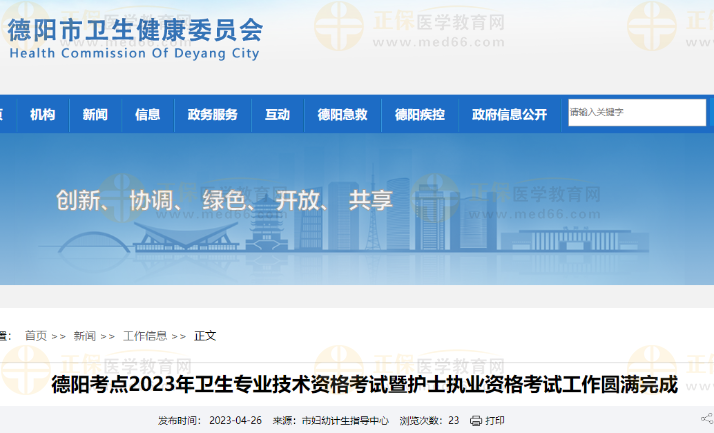 德陽市衛(wèi)生健康委員會發(fā)布德陽考點2023年衛(wèi)生專業(yè)技術資格考試暨護士執(zhí)業(yè)資格考試工作圓滿完成通知,醫(yī)學教育網(wǎng)整理具體內容如下: