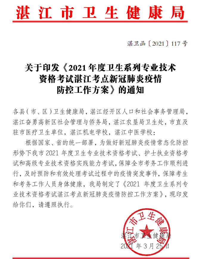 點(diǎn)擊閱讀全部通知內(nèi)容:關(guān)于印發(fā)《2021年度衛(wèi)生系列專業(yè)技術(shù)資格考試湛江考點(diǎn)新冠肺炎疫情防控工作方案》的通知