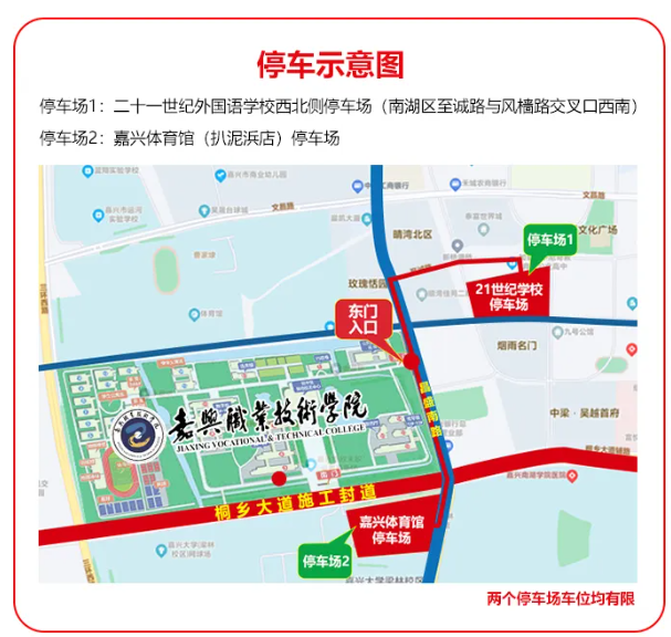 周邊最近停車點為二十一世紀外國語學校西北側(cè)停車場(南湖區(qū)至誠路與風檣路交叉口西南)和嘉興體育館(扒泥浜店)停車場(兩個停車場車位均有限),請考生充分考慮從停車場到學校、以及進校檢驗和排隊等候時間,確??记?小時到達考場、考前30分鐘到達考試教室門口。
