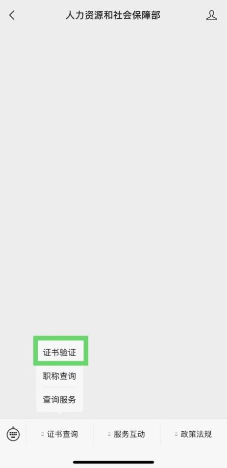 如已關(guān)注“人力資源和社會(huì)保障部”微信公眾號(hào),打開公眾號(hào)界面,依次點(diǎn)擊證書查詢-證書驗(yàn)證。