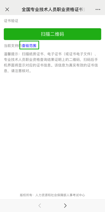 通過手機(jī)微信公眾號(hào)掃描紙質(zhì)證書、電子證書(或證書電子文件)、專業(yè)技術(shù)人員職業(yè)資格查詢結(jié)果證明上的二維碼,可驗(yàn)證證書信息。