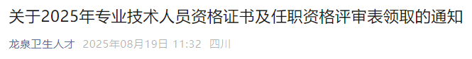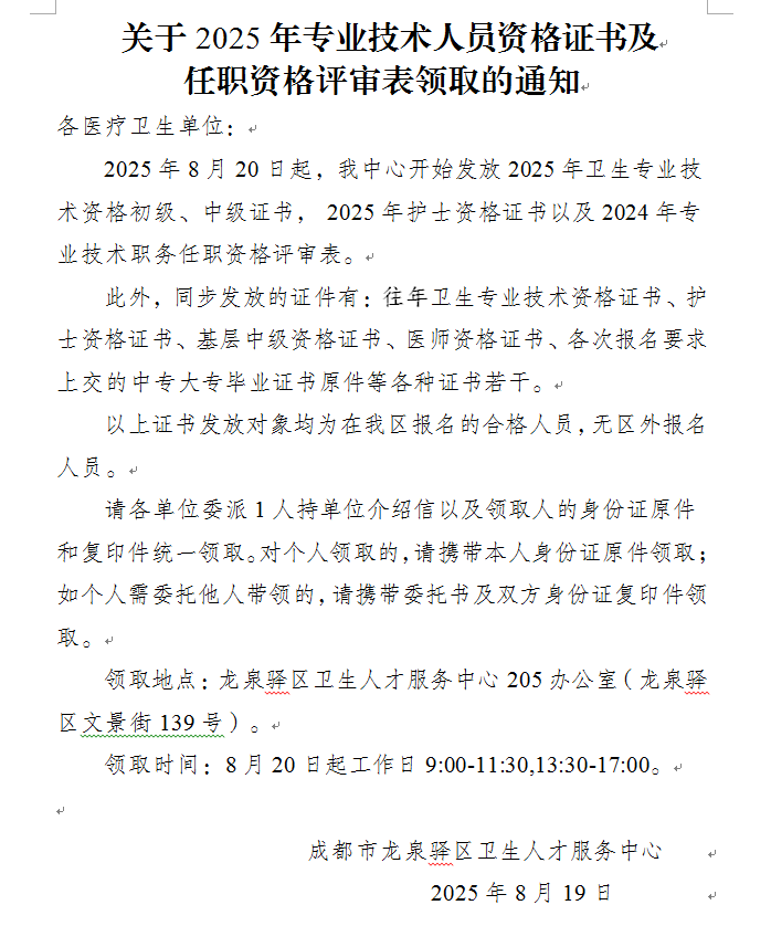 成都龍泉驛區(qū)2025年衛(wèi)生資格考試證書發(fā)放通知
