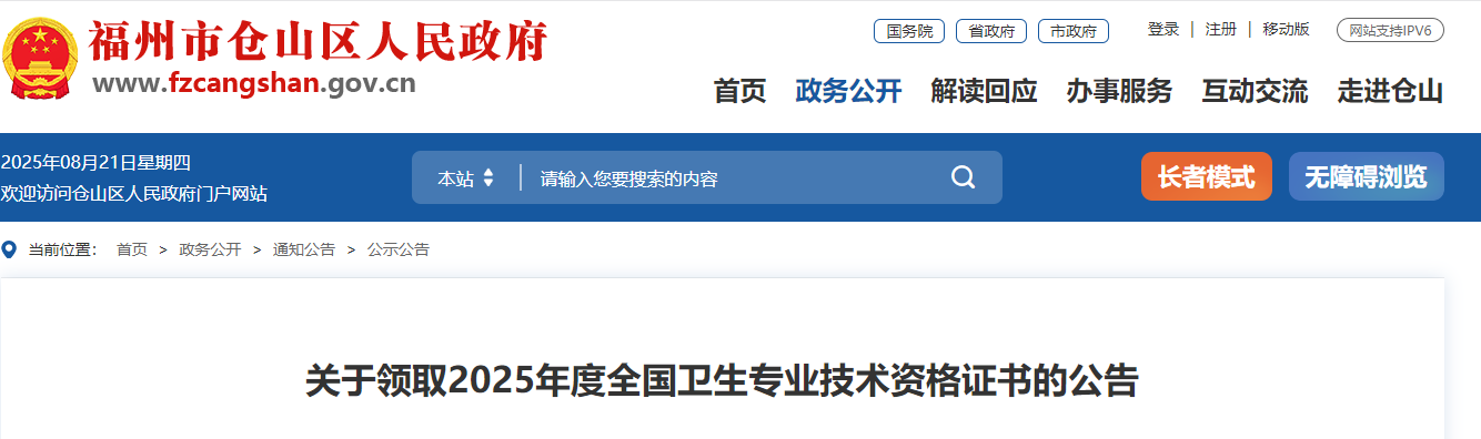 福州倉山區(qū)關于領取2025年度全國衛(wèi)生專業(yè)技術資格證書的公告