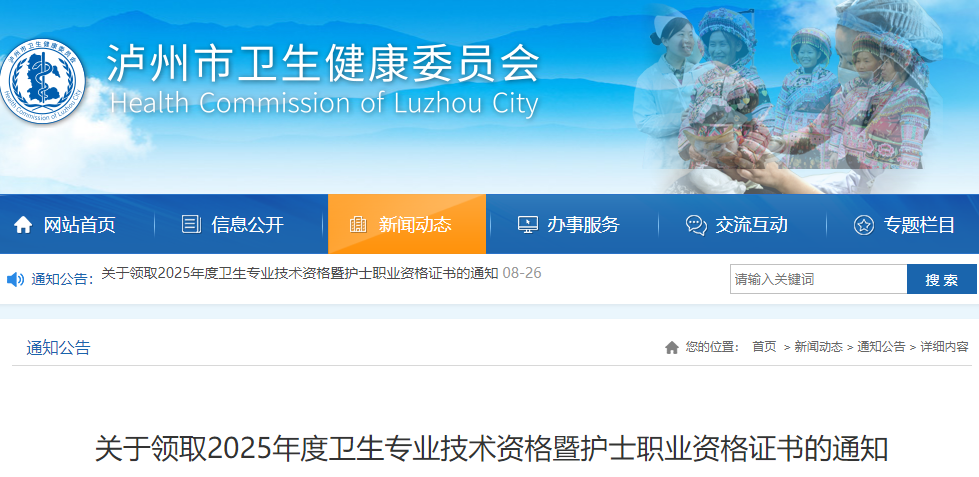 瀘州關(guān)于領(lǐng)取2025年度衛(wèi)生專業(yè)技術(shù)資格證書的通知