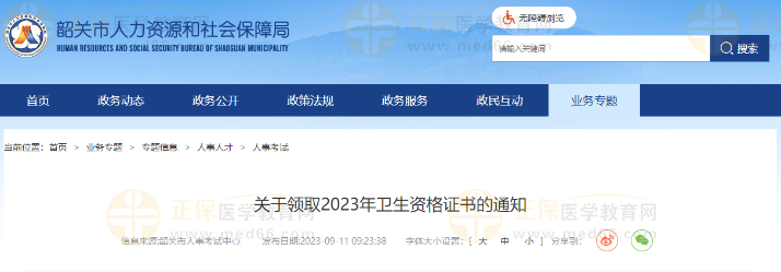 韶關(guān)市人力資源和社會(huì)保障局發(fā)布關(guān)于領(lǐng)取2023年衛(wèi)生資格證書的通知,醫(yī)學(xué)教育網(wǎng)整理具體內(nèi)容如下: