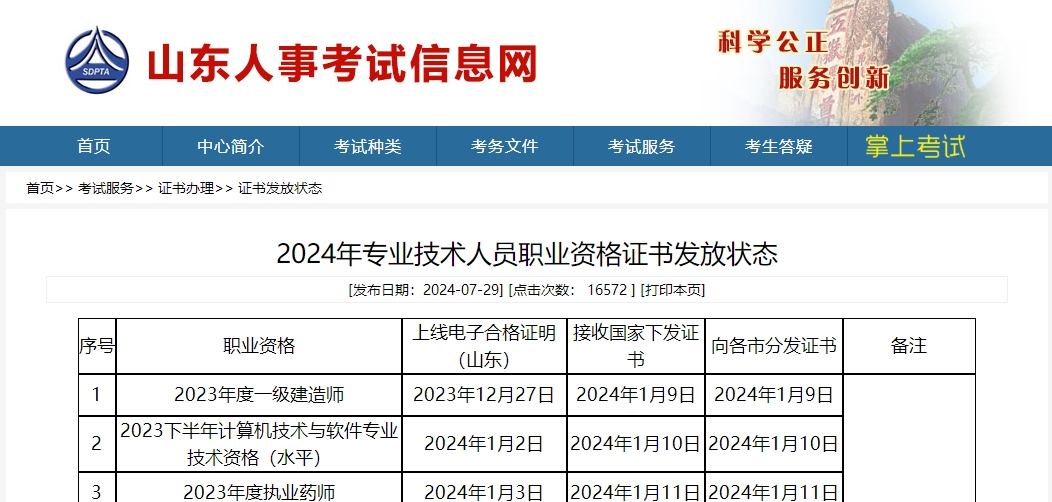 從通知內(nèi)容來看,山東省2024年7月28日已經(jīng)向各市分發(fā)證書,各位考生請(qǐng)關(guān)注報(bào)名所在市人事考試機(jī)構(gòu)網(wǎng)站發(fā)布的領(lǐng)取證書通知,根據(jù)通知內(nèi)容領(lǐng)取證書。