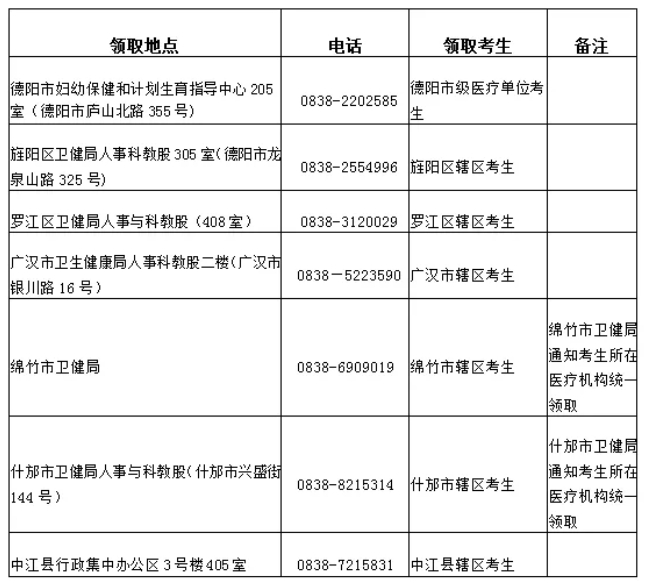請德陽市人民醫(yī)院、德陽市第二人民醫(yī)院、德陽市中西醫(yī)結(jié)合醫(yī)院、德陽市第六人民醫(yī)院、德陽第五醫(yī)院、德陽市口腔醫(yī)院、德陽市精神衛(wèi)生中心、德陽腫瘤醫(yī)院、德陽眼科醫(yī)院、德陽市疾病預(yù)防控制中心選派本單位職工持介紹信到中心統(tǒng)一領(lǐng)取,本中心不單獨發(fā)放以上醫(yī)療機(jī)構(gòu)考生證書。