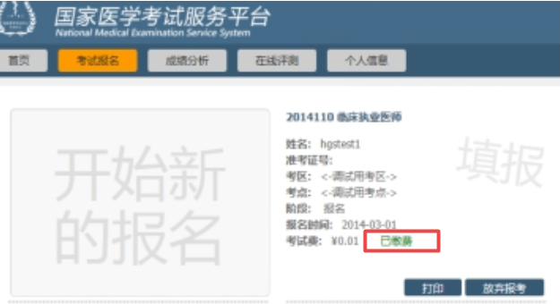 (三)完成繳費??忌罱K繳費成功的標(biāo)志,以國家醫(yī)學(xué)考試服務(wù)平臺考生服務(wù)端中的“已繳費”為準(zhǔn)。