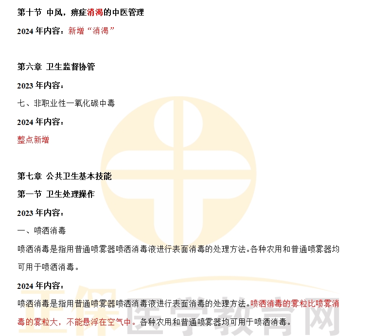 2024年鄉(xiāng)村全科助理醫(yī)師考試官方教材已發(fā)布,醫(yī)學(xué)教育網(wǎng)老師為大家整理“2024年鄉(xiāng)村全科助理醫(yī)師官方教材《公共衛(wèi)生》科目變動詳情”供大家了解,本部分共涉及七章內(nèi)容有變動,醫(yī)學(xué)教育網(wǎng)小編為大家整理詳細(xì)變動內(nèi)容如下: