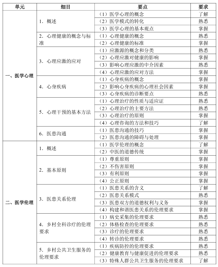 主要包括鄉(xiāng)村全科執(zhí)業(yè)助理醫(yī)師在基層服務(wù)中必須掌握和應(yīng)用的醫(yī)學(xué)心理、醫(yī)學(xué)倫理、衛(wèi)生法律法規(guī)等醫(yī)學(xué)人文學(xué)科的基本知識(shí)、行為準(zhǔn)則及相關(guān)基本技能。