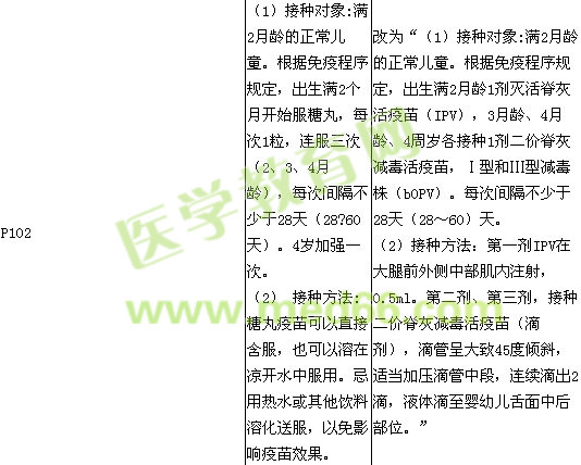 | P101 | 它引起的免疫反應(yīng)通常是體液免疫,很少引起細(xì)胞免疫。 | 它引起的免疫反應(yīng)通常是體液免疫,很少引起細(xì)胞免疫。 此句話下面添加“(四)接種單位應(yīng)具備的條件 1.具有醫(yī)療機(jī)構(gòu)執(zhí)業(yè)許可證書(shū)。 2.具有經(jīng)過(guò)縣級(jí)人民政府衛(wèi)生主管部門(mén)組織的預(yù)防接種專業(yè)培訓(xùn)并考核合格執(zhí)業(yè)醫(yī)師、執(zhí)業(yè)助理醫(yī)師、護(hù)士或鄉(xiāng)村醫(yī)生。 3.具有符合疫苗儲(chǔ)存、運(yùn)輸管理規(guī)范的冷藏設(shè)施、設(shè)備和冷藏保管制度。 4.承擔(dān)預(yù)防接種工作的城鎮(zhèn)醫(yī)療衛(wèi)生機(jī)構(gòu),應(yīng)當(dāng)設(shè)立預(yù)防接種門(mén)診。” |