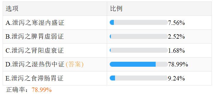 關(guān)于“泄瀉之濕熱傷中證——2023年鄉(xiāng)村全科助理醫(yī)師摸底測試A3/A4型題”的相關(guān)內(nèi)容,相信很多正在備戰(zhàn)2023年鄉(xiāng)村全科助理醫(yī)師考試的考生十分關(guān)注,此題在摸底測試50題(點擊參加測試>>)中正確率僅為78.99%,建議大家及時復(fù)習(xí),牢固掌握相關(guān)知識點!