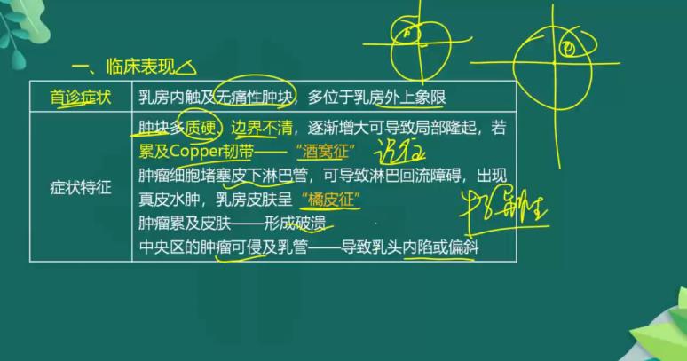 乳腺癌的發(fā)病率占女性惡性腫瘤的第一位,且呈逐年上升趨勢。乳腺癌的特征性表現(xiàn)是??嫉狞c,大家注意區(qū)分。2種特殊乳腺癌也注意與乳腺炎等進行鑒別。