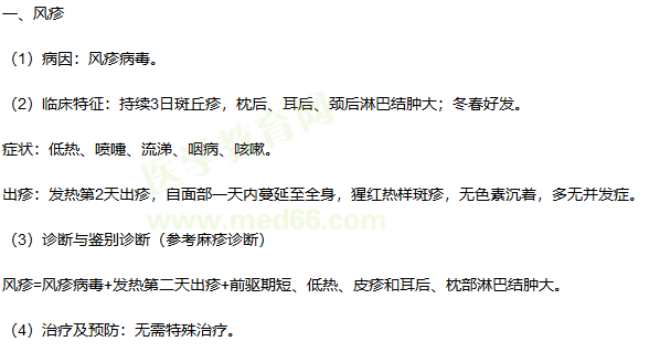 該知識點均為感染性疾病,醫(yī)學(xué)|教育網(wǎng)首先都有感染性的特點,一般要有一個潛伏期,再有發(fā)熱,然后全身的癥狀,胃口不佳,隨著疾病發(fā)展到一定程度都有典型的皮疹表現(xiàn)出來。所以,本知識點重要的仍是鑒別,掌握了鑒別點,才能進(jìn)一步的進(jìn)行判斷治療。題型多為A型。