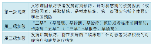 第二級(jí)預(yù)防:三早”(早發(fā)現(xiàn)、早診斷、早治療)、“五早”(“三早”+早報(bào)告、早隔離);.第三級(jí)預(yù)防: 在疾病的“臨床期”針對(duì)患者采取積極的對(duì)癥治療和康復(fù)治療措施。