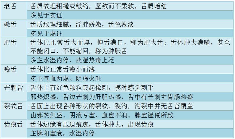 異常舌分為老舌、嫩舌、胖舌、瘦舌、芒刺舌、裂紋舌、齒痕舌。