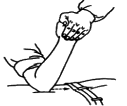 (2)掌推法:操作時,以掌根部(或全掌)著力,腕關(guān)節(jié)略背伸,肩關(guān)節(jié)為運動支點,上臂主動用力,帶動肘關(guān)節(jié)屈伸,使手掌向前做單方向推動。