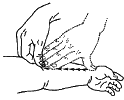 術(shù)者用雙手拇指螺紋面或掌面緊貼在體表上,自穴位兩旁推向穴位中間。
