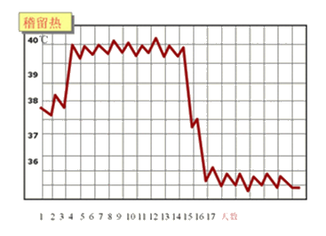 (1)稽留熱:體溫持續(xù)在39~40℃以上達(dá)數(shù)天或數(shù)周,24小時(shí)內(nèi)波動(dòng)不超過(guò)1℃。常見(jiàn)于肺炎鏈球菌肺炎和傷寒等。
