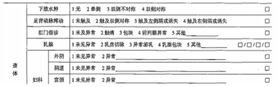 (5)查體欄中“足背動(dòng)脈搏動(dòng)”,糖尿病患者必須進(jìn)行此項(xiàng)檢查。