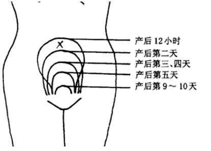 ①于產(chǎn)后1周子宮縮小至約妊娠12周大小,恥骨聯(lián)合上方2~3橫指可觸及;