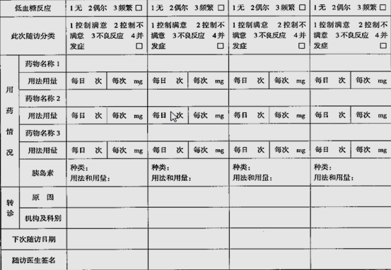| 增藥、換藥 2周內(nèi)隨訪 | 第一次出現(xiàn)空腹血糖≥7.0mmol/L或藥物不良反應(yīng)患者 | |