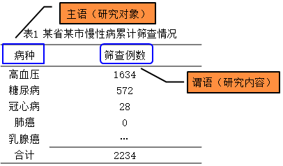 標目 | 被研究事物作為橫標目分組,位于表格左側(cè)(主語);統(tǒng)計分析指標作為縱標目位于表格上端(謂語);有單位注明計量單位。 |