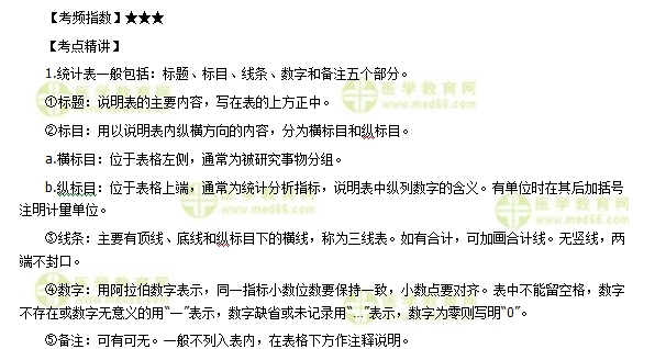 【答案解析】統(tǒng)計表中,橫標目是研究對象,列在表格左側,所以 B 項敘述錯誤。