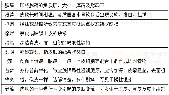 【答案解析】鱗屑:即將脫落的角質(zhì)層,大小、厚薄及形態(tài)不一;浸漬:皮膚長時間處于潮濕狀態(tài),角質(zhì)層含水量較多后出現(xiàn)變軟、發(fā)白、起皺;糜爛:表皮或黏膜上皮的缺損;潰瘍:深達真皮、皮下組織的限局性缺損;裂隙:亦稱皸裂,指皮膚的線條狀裂口。