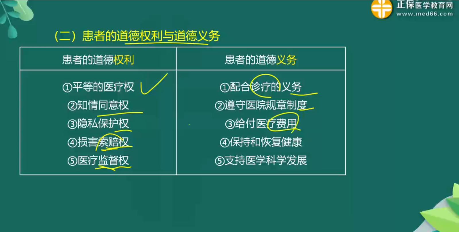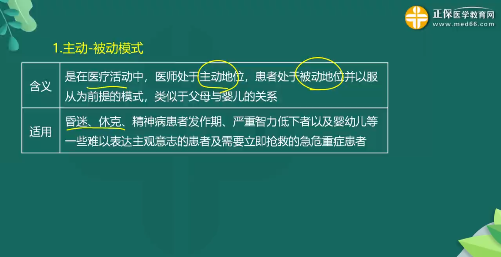 醫(yī)患關(guān)系模式包括主動-被動模式、指導(dǎo)-合作模式、共同參與模式。醫(yī)患雙方的道德權(quán)利與義務(wù)考試???,有時會以A2型題的形式考查大家,所以需要大家真正理解,在做題時才不會沒有頭緒。
