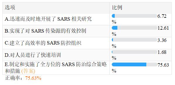 17.在2003年,突如其來(lái)的SARS疫情襲擊了我國(guó),并在一段時(shí)間內(nèi)造成了國(guó)民的普遍恐慌。為了有效地應(yīng)對(duì)SARS,我國(guó)政府出臺(tái)了《突發(fā)公共衛(wèi)生事件應(yīng)急反應(yīng)條例》,在全國(guó)范圍內(nèi)成立了防非典指揮部,國(guó)家重點(diǎn)科研院所和實(shí)驗(yàn)室啟動(dòng)了SARS研究項(xiàng)目,全國(guó)各級(jí)疾控中心迅速開(kāi)展了相應(yīng)的流行病學(xué)調(diào)查工作。經(jīng)過(guò)全國(guó)人民的共同努力,SARS最終得到了有效的控制。我國(guó)能在較短時(shí)間內(nèi)有效控制SARS的最為關(guān)鍵原因是 (E)