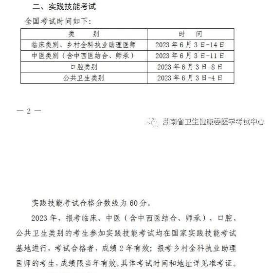 根據(jù)湖南省發(fā)布的2023年醫(yī)師資格考試公告得知,湖南省2023年鄉(xiāng)村全科助理醫(yī)師實踐技能考試時間為2023年6月3日-14日,實踐技能考試合格分?jǐn)?shù)線為60分。2023年,報考臨床、中醫(yī)(含中西醫(yī)結(jié)合、師承)、口腔、公共衛(wèi)生類別的考生參加實踐技能考試均在國家實踐技能考試基地進(jìn)行,考試合格者,成績2年有效;報考鄉(xiāng)村全科執(zhí)業(yè)助理醫(yī)師的考生,成績限當(dāng)年有效。具體考試時間和地址詳見準(zhǔn)考證。