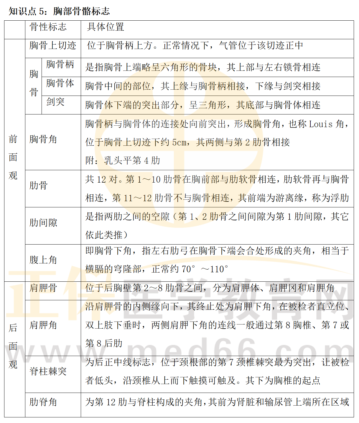 胸部骨骼標(biāo)志考點(diǎn)總結(jié)表