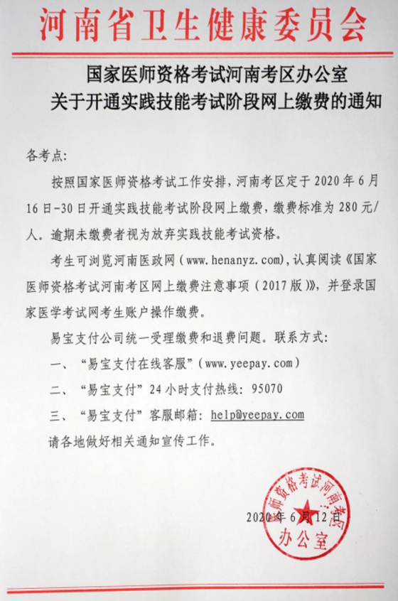 按照國家醫(yī)師資格考試工作安排,河南考區(qū)定于2020年6月16—30日開通實(shí)踐技能考試階段網(wǎng)上繳費(fèi),繳費(fèi)標(biāo)準(zhǔn)為280元/人。逾期未繳費(fèi)者視為放棄實(shí)踐技能考試資格。