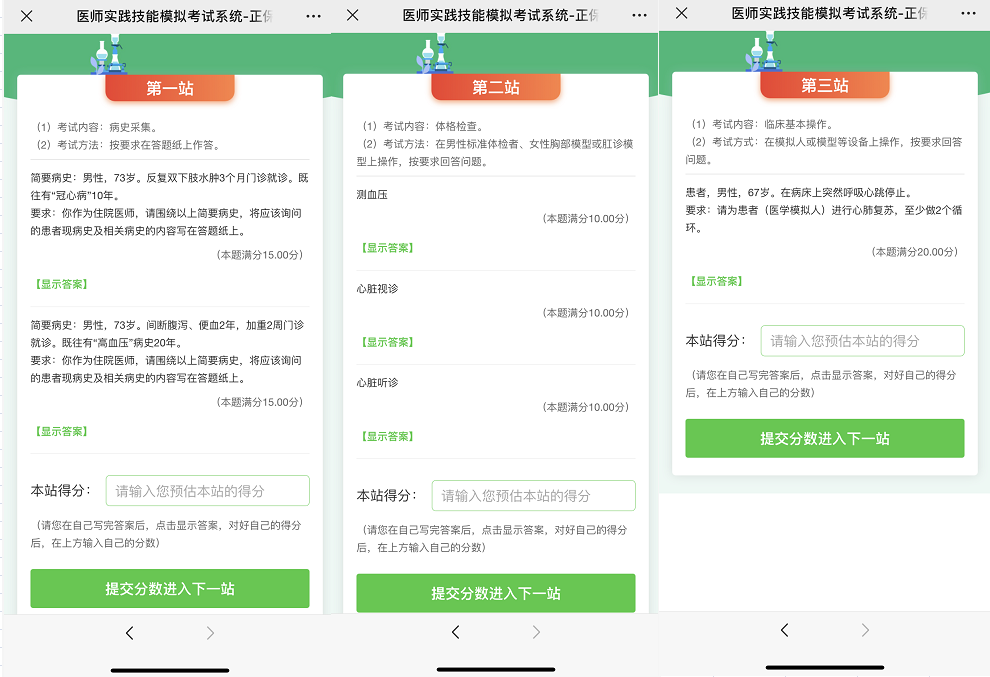 第一站試題做完后填寫預(yù)估的分數(shù)就會進入第二站的試題,第二站做完后提交預(yù)估分數(shù)進入第三站的試題...五站都完成練習后會生成考試成績!鄉(xiāng)村全科助理醫(yī)師總共有3套試題供練習!