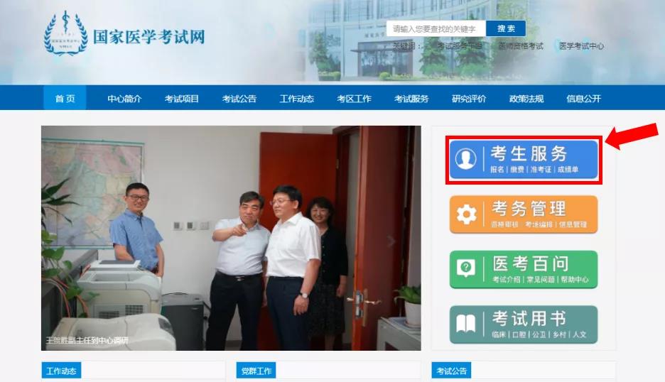 第一步:進(jìn)入國家醫(yī)學(xué)考試網(wǎng)點(diǎn)擊“考生服務(wù)”。