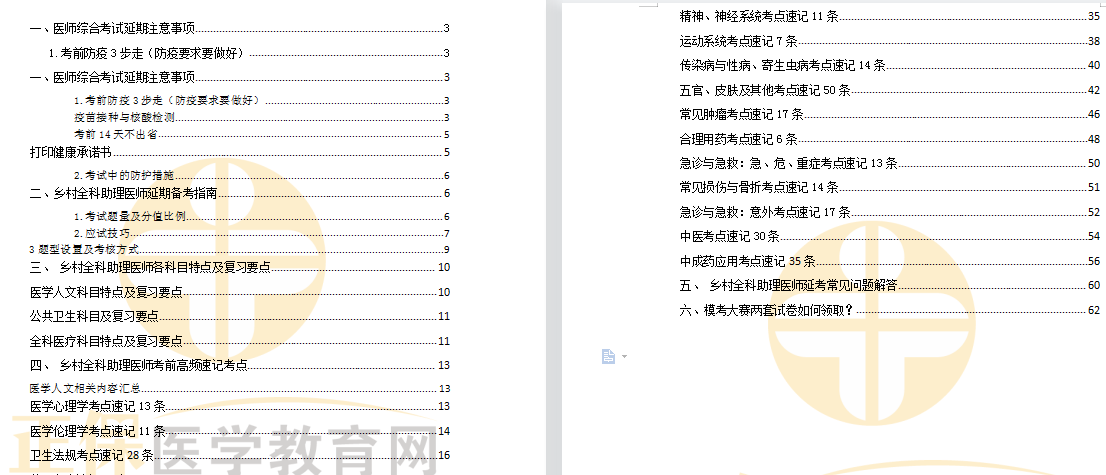 專治延考綜合癥的《醫(yī)師延期備考手冊(cè)》來啦!?。?/p> 醫(yī)學(xué)教育網(wǎng)老師精心研究十余年醫(yī)考 總結(jié)出「 星級(jí)考點(diǎn)」 整理出重要系統(tǒng)高頻&高性價(jià)比考點(diǎn) 延考期間,人手各備一份,利用碎片時(shí)間 隨時(shí)隨地都可以背誦記憶 打好考前攻堅(jiān)戰(zhàn) 預(yù)祝各位圓夢(mèng)醫(yī)考! 掃碼免費(fèi)領(lǐng)取↓↓↓ 《全國2021年醫(yī)師延期備考手冊(cè)》目錄 1.小編整理了醫(yī)師綜合考試延期注意事項(xiàng),包含防疫須知、延考啟航計(jì)劃等; 《鄉(xiāng)村全科助理延期備考手冊(cè)》部分截圖 2.充分了解醫(yī)師考試題量及分值比例、考試趨勢(shì)分析、題型設(shè)置特點(diǎn)及考核方式等; 《鄉(xiāng)村全科助理延期備考手冊(cè)》部分截圖 3.涵蓋重點(diǎn)系統(tǒng)「 高星考點(diǎn)」,標(biāo)出各考點(diǎn)歷年所占分值,幫助考生在考前沖刺階段抓重點(diǎn)復(fù)習(xí),爭取拿到應(yīng)拿的分?jǐn)?shù)! 《鄉(xiāng)村全科助理醫(yī)師延期備考手冊(cè)》部分截圖 4.精選各科目【高頻考點(diǎn)】作為考前速記重點(diǎn),重要知識(shí)點(diǎn)用彩色字體標(biāo)出,清晰明了,加深記憶; 《鄉(xiāng)村全科助理醫(yī)師延期備考手冊(cè)》部分截圖 4、PDF文件可打印,考前隨時(shí)隨地背誦。