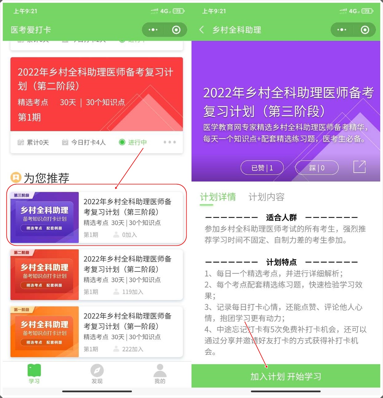 第三步:選擇備考科目后即進(jìn)入學(xué)習(xí)計(jì)劃選擇的頁面,請(qǐng)選擇“您的備考計(jì)劃”,如鄉(xiāng)村全科助理醫(yī)師備考復(fù)習(xí)計(jì)劃(第三階段),然后點(diǎn)擊下方“加入計(jì)劃 開始學(xué)習(xí)”按鈕,開始正式進(jìn)入打卡學(xué)習(xí)。