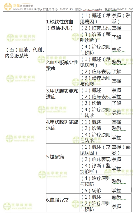血液、代謝和內(nèi)分泌這部分內(nèi)容,大綱要求掌握6個(gè)疾病。缺鐵性貧血、血小板減少性紫癜屬于血液疾病,其中血小板減少性紫癜大綱要求熟悉即可。內(nèi)分泌這部分要求掌握兩個(gè)疾病,分別是甲狀腺功能亢進(jìn)癥與甲狀腺功能減退癥,這兩個(gè)疾病完全可以結(jié)合一起來復(fù)習(xí),它們的表現(xiàn)與治療都是相對(duì)的醫(yī)學(xué)教育|網(wǎng)編輯整理。而充分地了解甲狀腺激素的作用對(duì)于理解這兩個(gè)疾病來說很重要,磨刀不誤砍柴工。代謝疾病包括了糖尿病與血脂異常,這也是大家在平常工作中見到最多的慢性病了,不會(huì)陌生,糖尿病是考試重點(diǎn)。