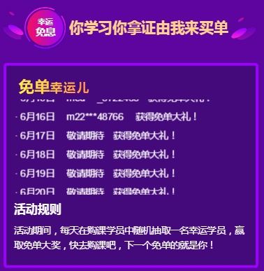 6月15日-6月23日期間 每天在購課學(xué)員中隨機(jī)抽取一名幸運(yùn)學(xué)員,贏取免單大獎(jiǎng)。